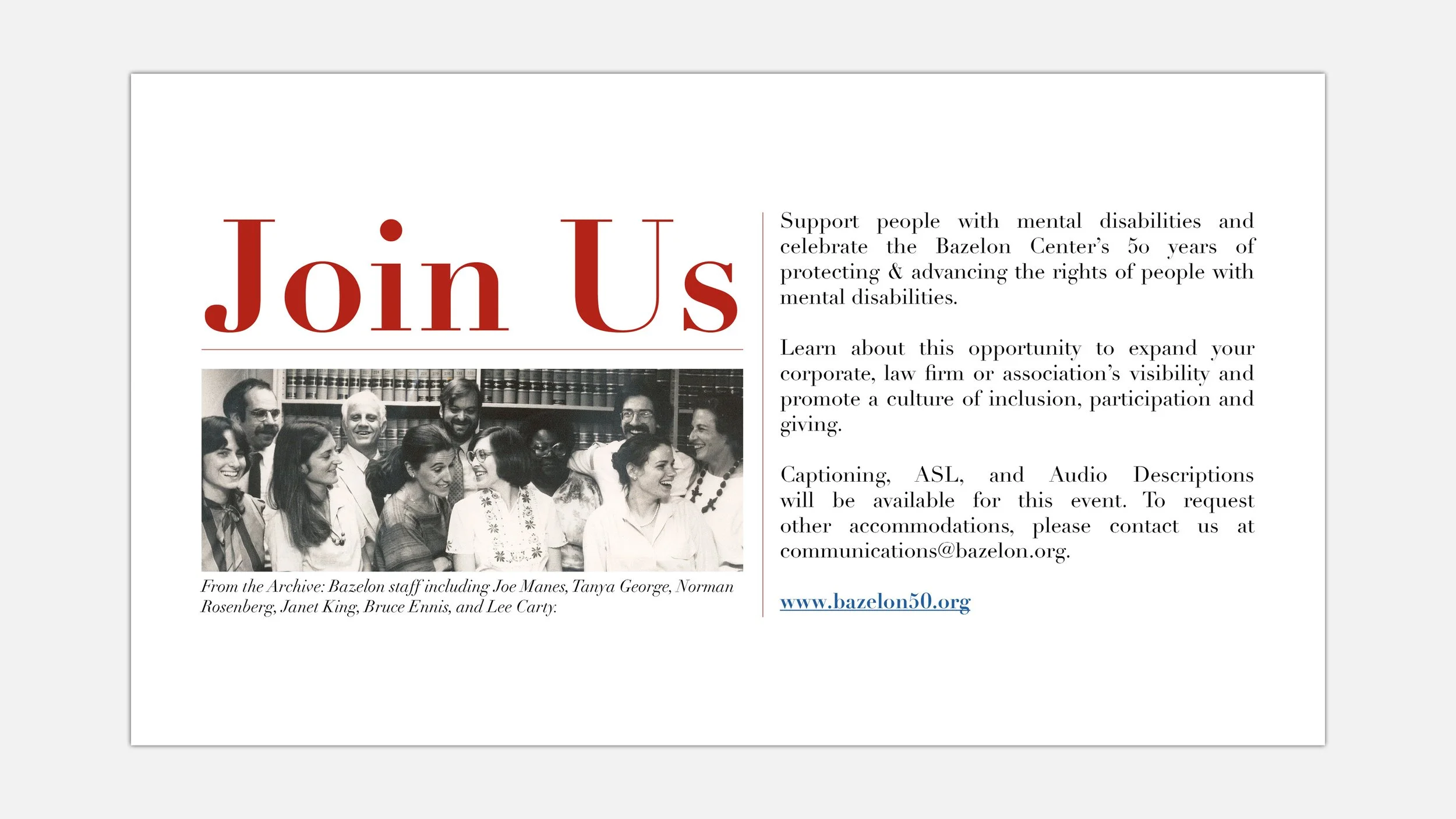 Identity and web design commemorating the 50th anniversary of the Bazelon Center, a litigation non-profit that advocates for the civil rights, full inclusion and equality of adults and children with mental disabilities.